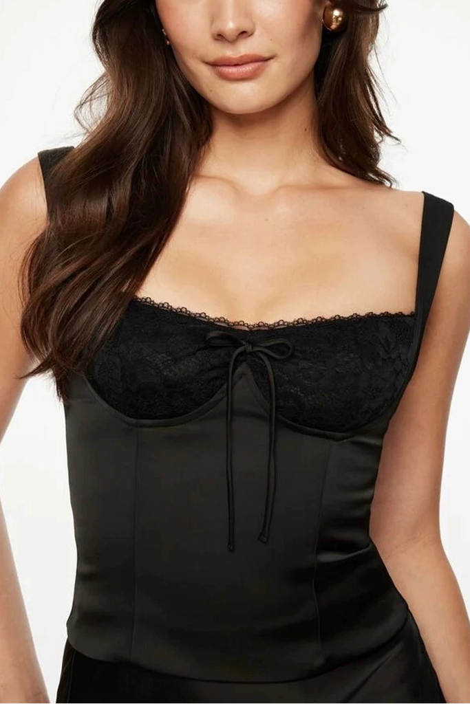 vintage lace paneled bow lace-up black satin glossy cropped suspender top