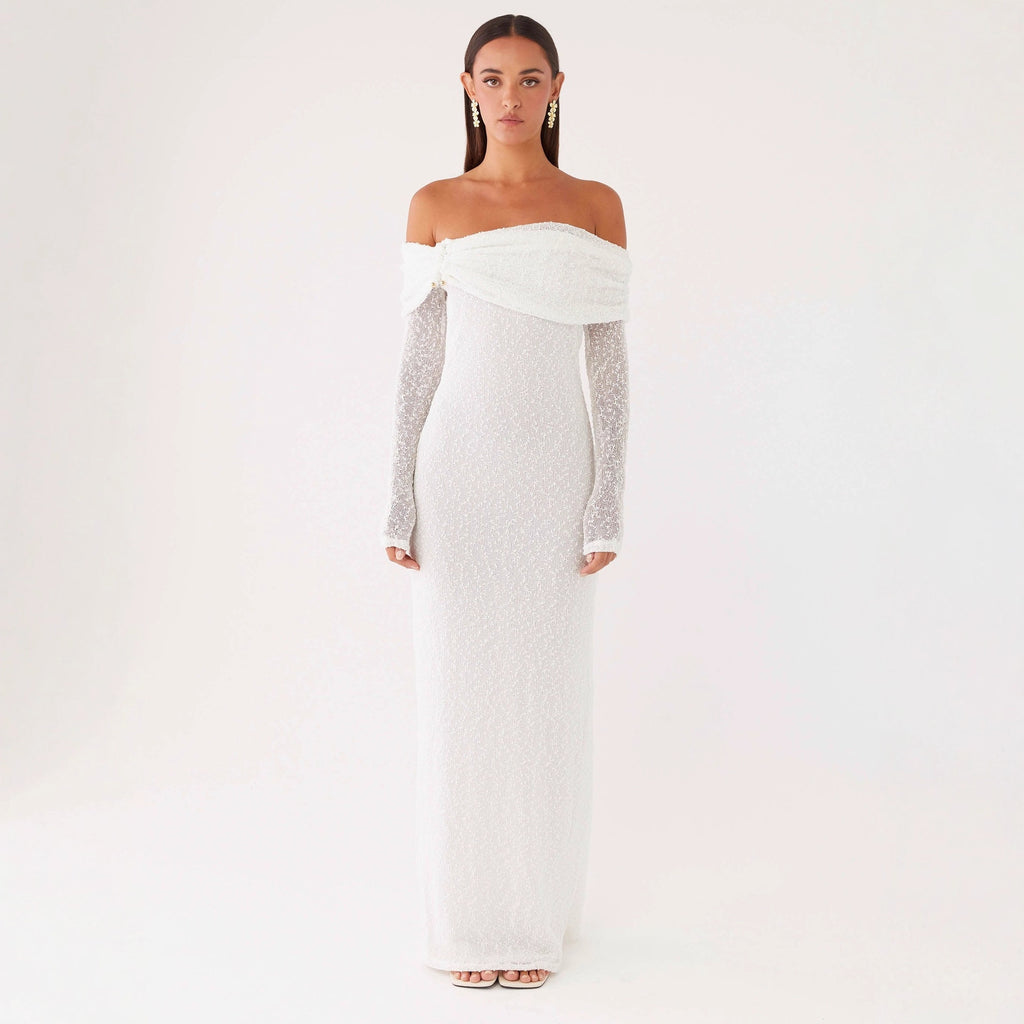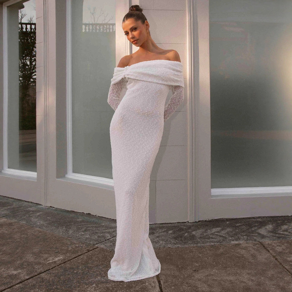 white long-sleeved knitted one-shoulder dress – Bellepolly
