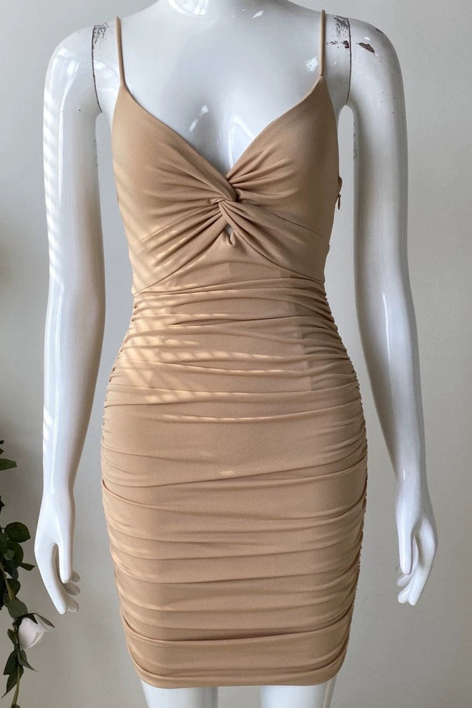 apricot cream stretch waist V-neck shoulder dress