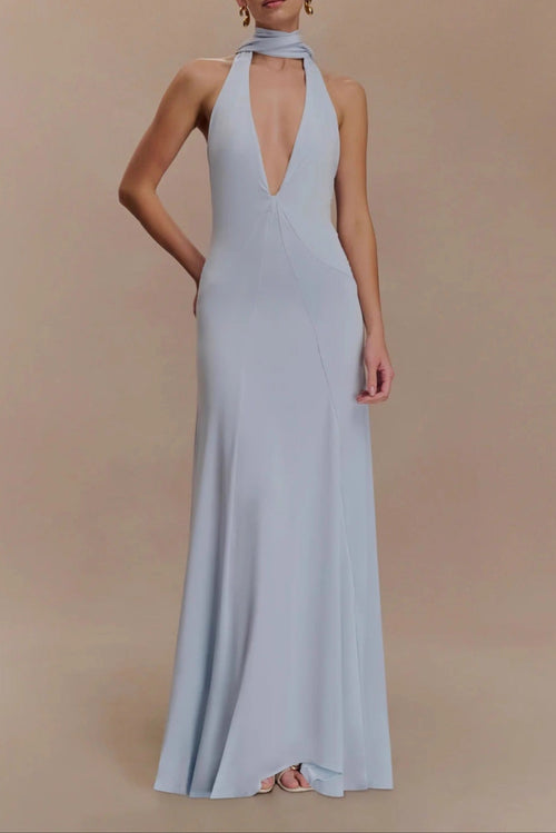 deep V-neck streamer halterneck pleated open back dress