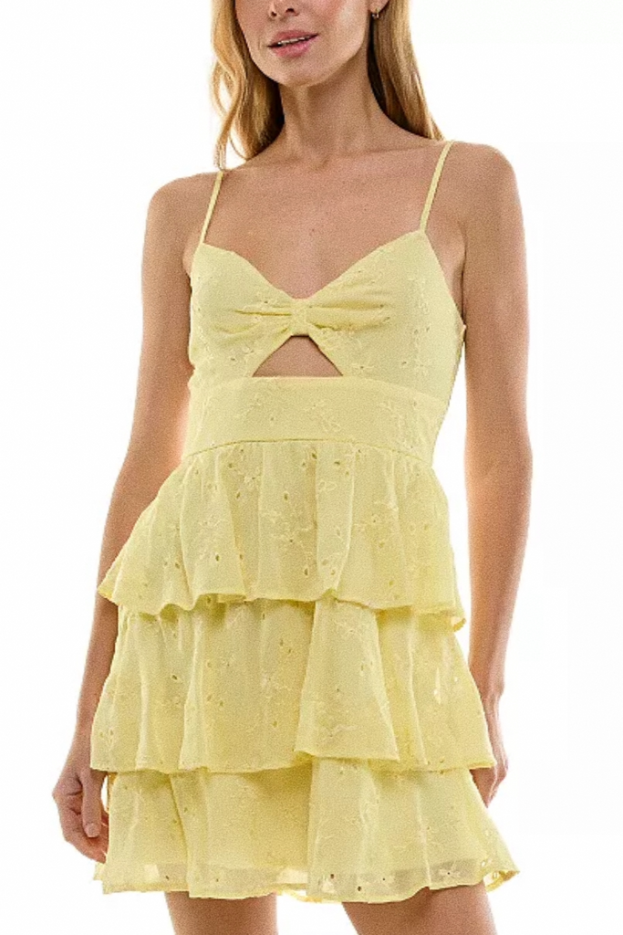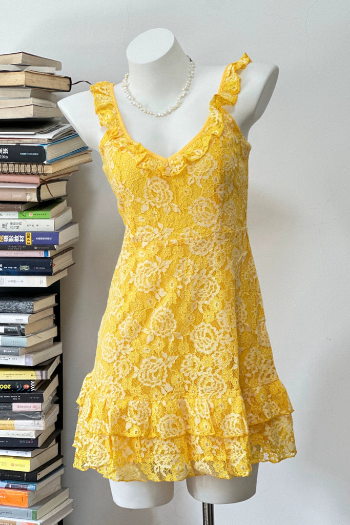 yellow Satin Ruffled V-Neck Backless Slip Dress