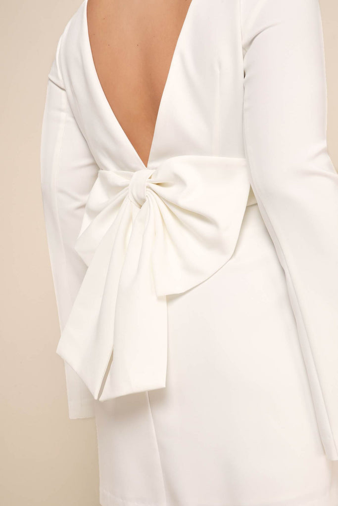 This Ivory Bow Long Sleeve Backless Mini Dress effortlessly combines elegance and playfulness for a one-of-a-kind look. Crafted with a luxurious ivory fabric, the dress features a delicate bow detail, long sleeves, and a backless design. Perfect for any occasion, this dress will make you stand out with its unique style.