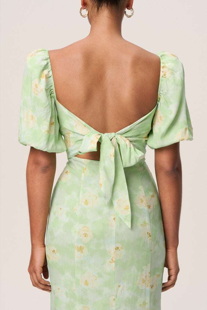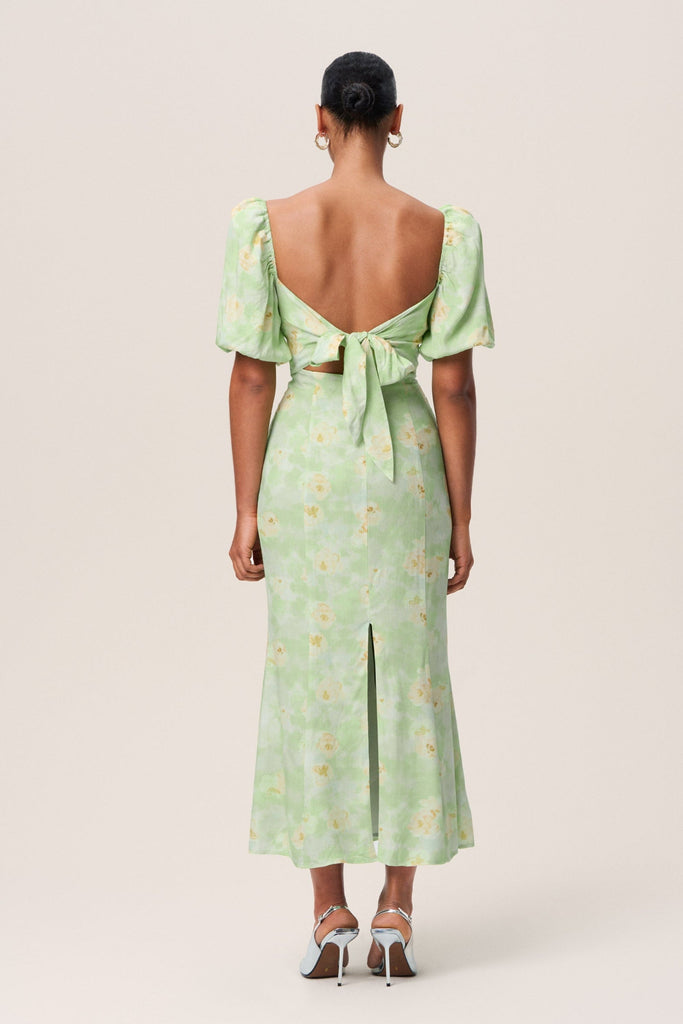 Vercelli Maxi Dress in green with a dull floral print has a flattering silhouette that gracefully contours the body and is featuring an alluring back tie band closure and voluminous sleeves. The dress is maxi lengthed and has a CB leg slit.