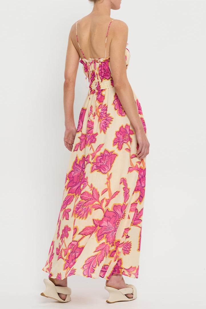 Rhia is a vibrant hand painted pink & tangerine floral on a soft cream base. The Rhia Maxi Dress features an elasticed bodice with frill detail, adjustable straps with tie at back, complete with side pockets.