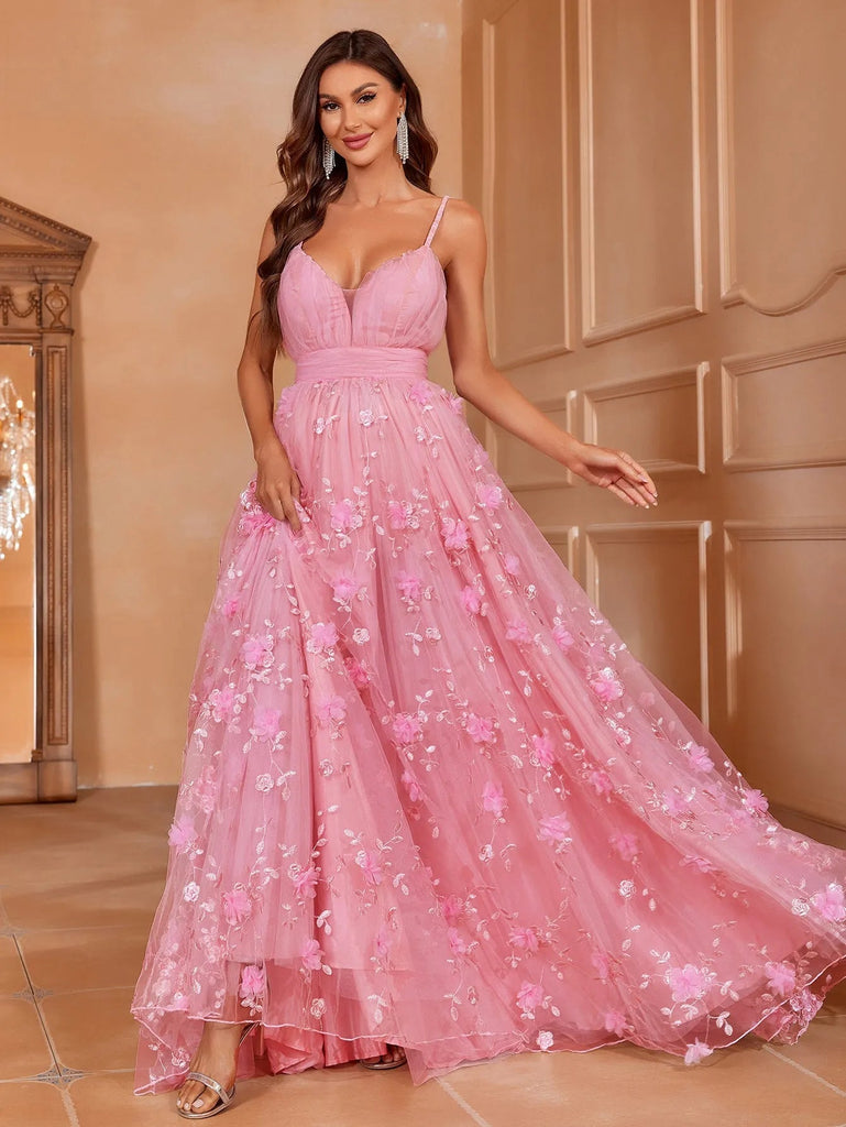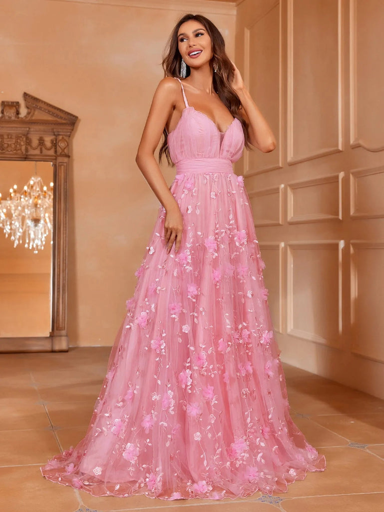 Elegant Plunging Neck Floral Applique Mesh Cami Party Dress