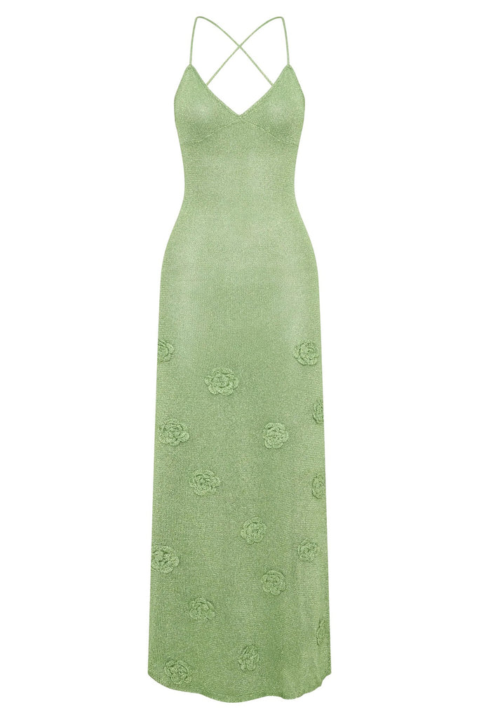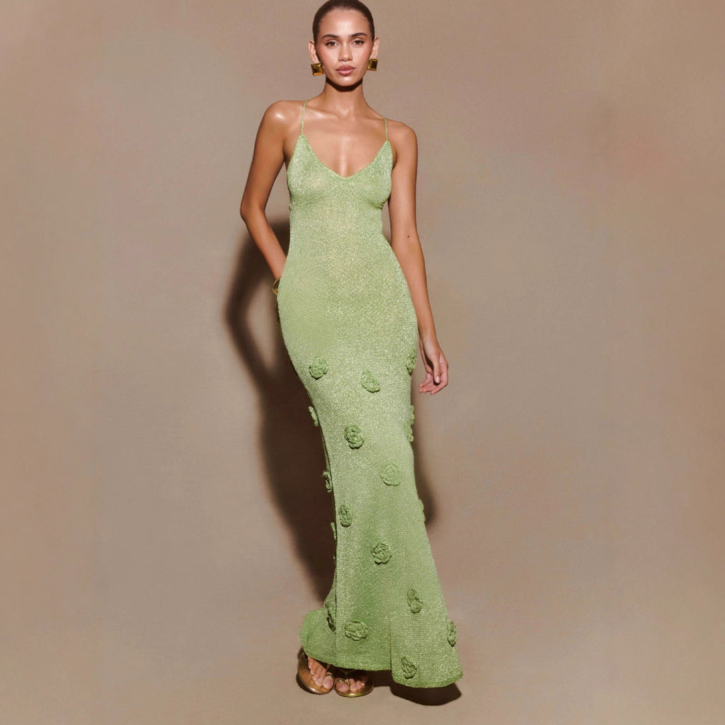 green three-dimensional flower backless dress - S is backordered and will ship as soon as it is back in stock.