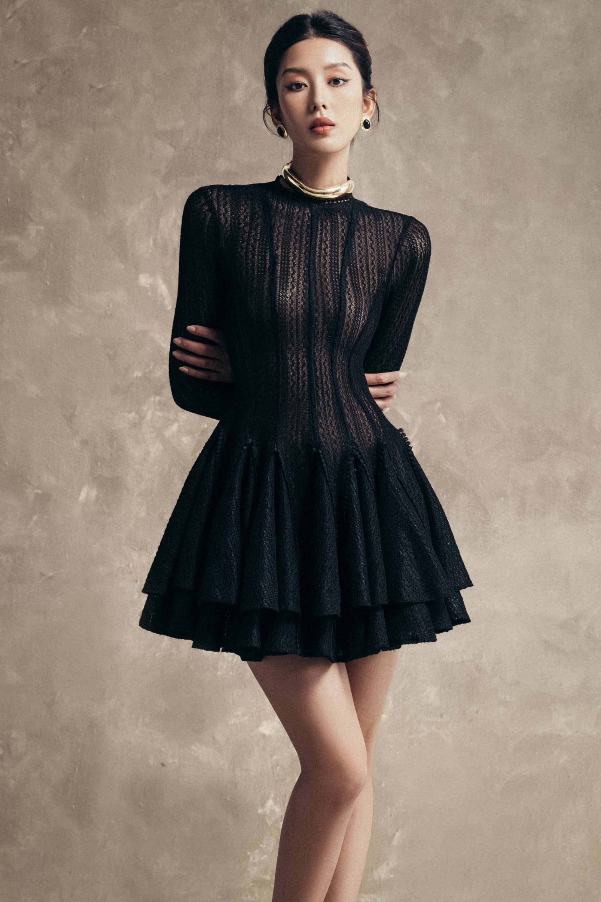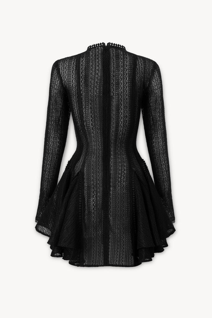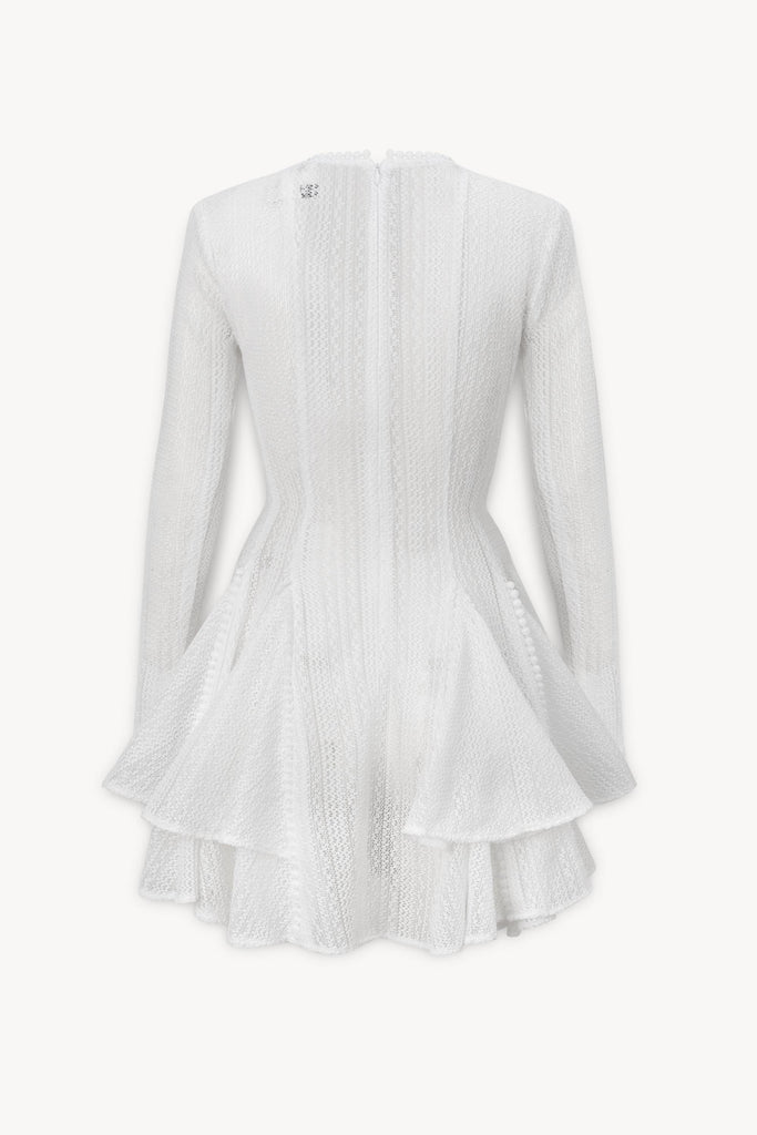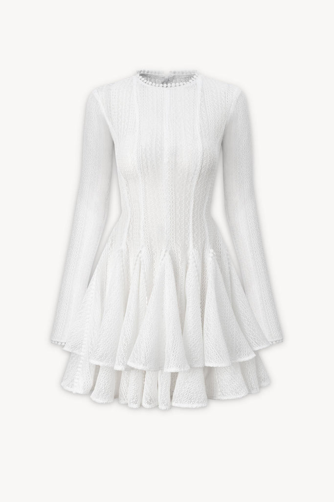THE DETAILS • Crochet • Round neck • Lace trim detail • Double layers skirt • Long sleeves with slits • Thigh-length • Back zip fastening • Undergarment is not included