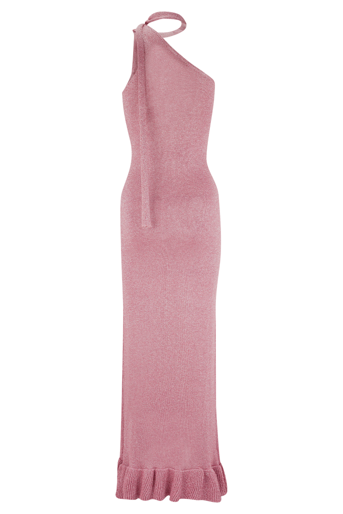 The CELESTINO Floral Metallic Knit Maxi Dress is made for sun-drenched celebrations and moonlit moments. Featuring an asymmetrical one-shoulder neckline with a statement wrap-around neck sash, this bodycon silhouette flatters with sculpted ease. The high-low hem adds graceful movement, finished with a ruffled edge and standout floral appliqué detailing. With a subtle metallic shimmer woven throughout, this dress is your ultimate occasion piece—from beachside dinners to golden hour events that call for something unforgettable.
