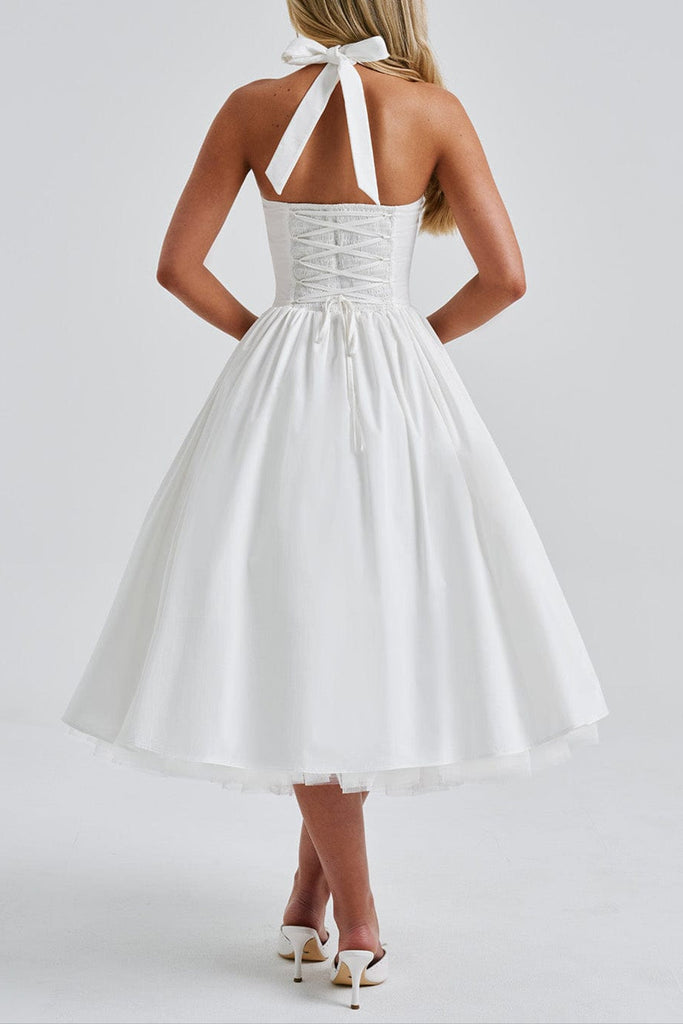 Cressida is elegant yet playful, boasting a flattering square halter neckline and princess seams to give a super flattering, snatched silhouette. The body is complemented by a full skirt with peek-a-boo tulle for added drama. The look is complete with tie back fastening and lace up back for your perfect fit.