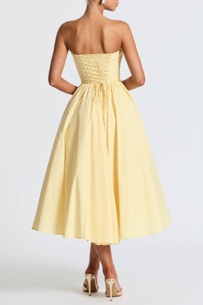 Indulge in the luxurious Prim Midi Dress in vibrant lemon. This strapless sundress features a plunge sweetheart neckline and pleated, underwired cups for support. The corset overlay with boning and bow detail add a touch of sophistication, while the lace up back allows for a perfect fit. The full, voluminous skirt with tulle lining adds an elegant and flirty element to this exquisite piece.
