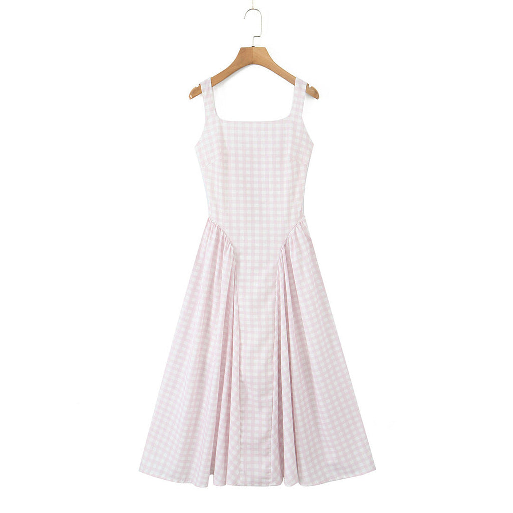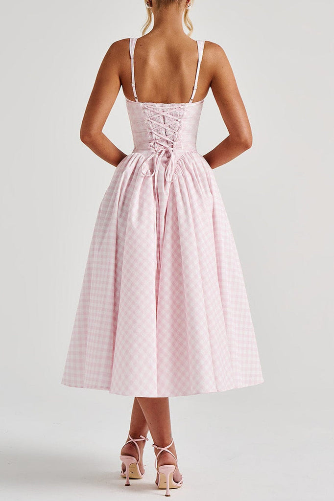 The Sherrie Midi Dress in Pink Gingham is the epitome of soft femininity, effortlessly blending comfort and style for any occasion. The fitted bodice and lace-up back create a flattering, tailored silhouette, while the voluminous gathered skirt with godet inserts adds a romantic flair.