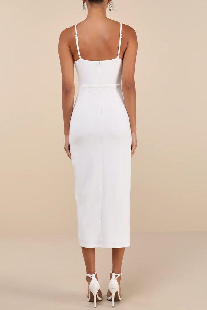 Prepare for double takes and compliments all night long in the White Bustier Tulip Midi Dress! This ultra-flirty dress has a techno crepe composition that falls from adjustable spaghetti straps into a sweetheart neckline with lightly padded cups and a pleated bust. A bustier-inspired bodice boasts flattering seam detailing and supportive side boning atop a fitted waist. Figure-skimming, overlapping tulip skirt features gathering at the side before falling to a midi hem. Hidden back zipper/clasp.