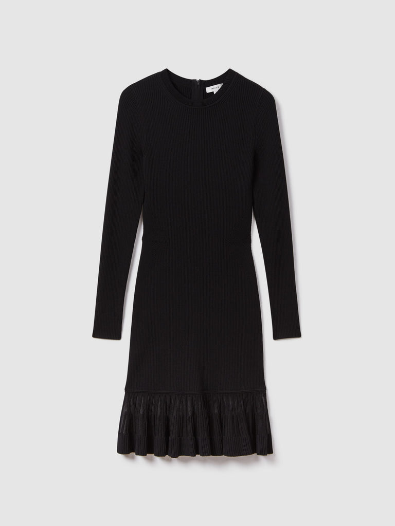 Crafted from a luxurious knitted fabric, this sheer flared mini dress in black effortlessly combines comfort and style. Its intricate design creates a flattering silhouette, making it a versatile and chic addition to any wardrobe. Perfect for any occasion, this dress is a must-have for any fashion-forward individual.