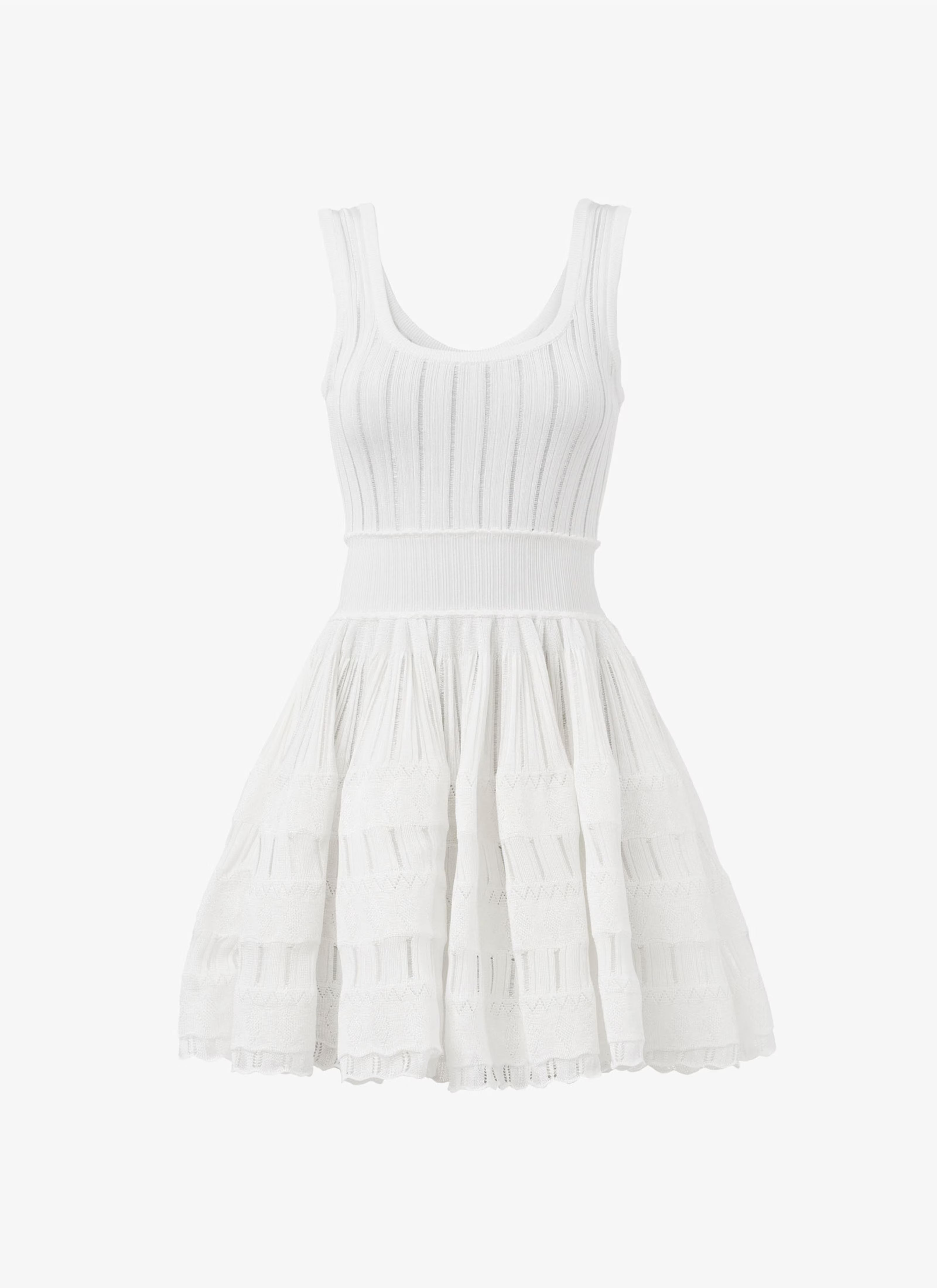 This white ribbed pointelle knit mini dress combines delicate craftsmanship with a flattering silhouette. The fine pointelle knit offers subtle texture and breathability, while the ribbed design ensures a comfortable, form-fitting shape. Perfect for layering or wearing alone, this mini dress balances elegance and casual ease for versatile styling.