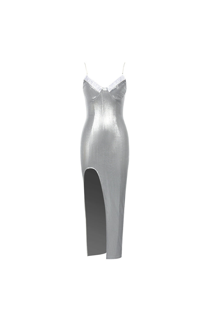 Elevate your style with our Strappy Split Midi Dress in silver. This stunning dress features delicate straps and a flattering midi length, perfect for any occasion. Made with high-quality silver fabric, this dress adds a touch of elegance to your wardrobe. Feel confident and glamorous in this must-have fashion piece.