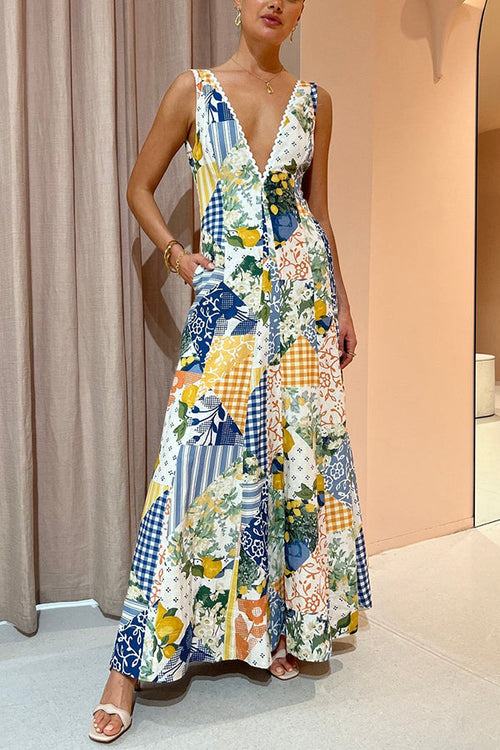 Eternal Italian Paradise Linen Blend Patchwork Print Pocketed Maxi Dress
