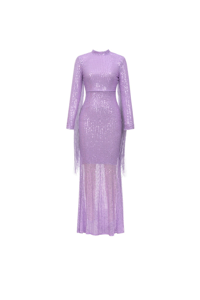 This purple sequin fringe maxi dress adds a touch of glitz and glamour to any event. With its sequin embellishments and fringe details, this dress is perfect for a fun night out or a special occasion. The dress flows beautifully and is sure to make a statement.
