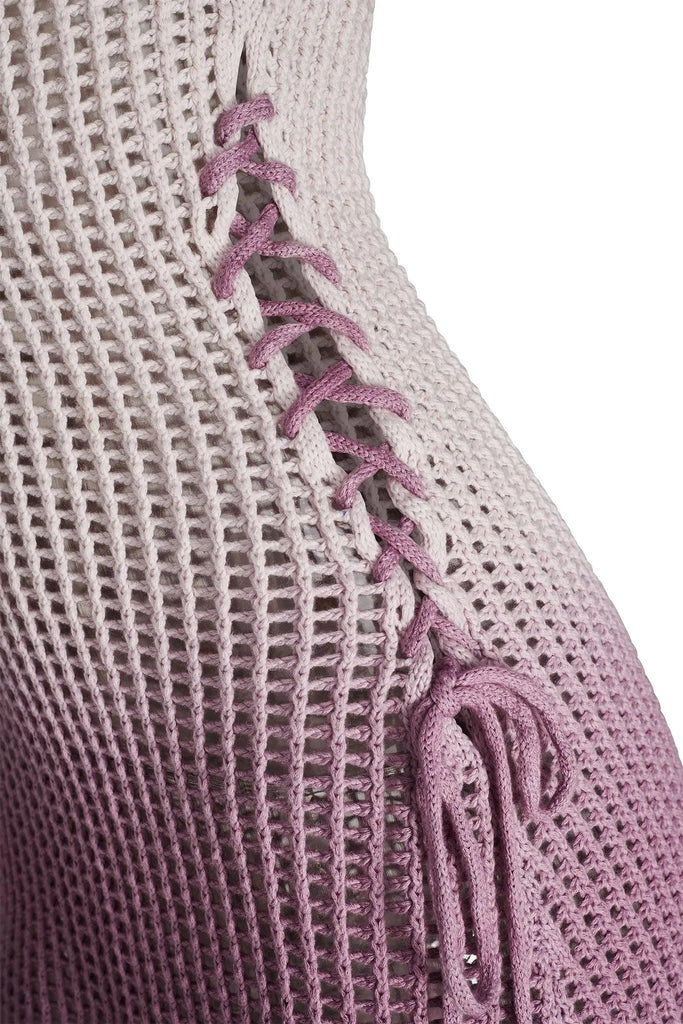 White and purple ombre mini dress in an open knit crochet fabrication. Dip dyed by hand - Each piece is unique,Featuring functional purple lace up detail on the wearer's left waist - Unlined - This style is semi sheer due to the nature of the fabric,Wear as a beach coverup and pair with your swimwear or wear on a night out with your favourite lace intimate set ,Due to the delicate nature of this garment please handle with extra care.
