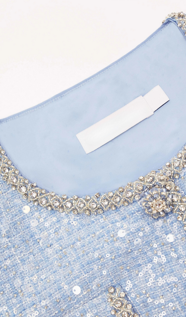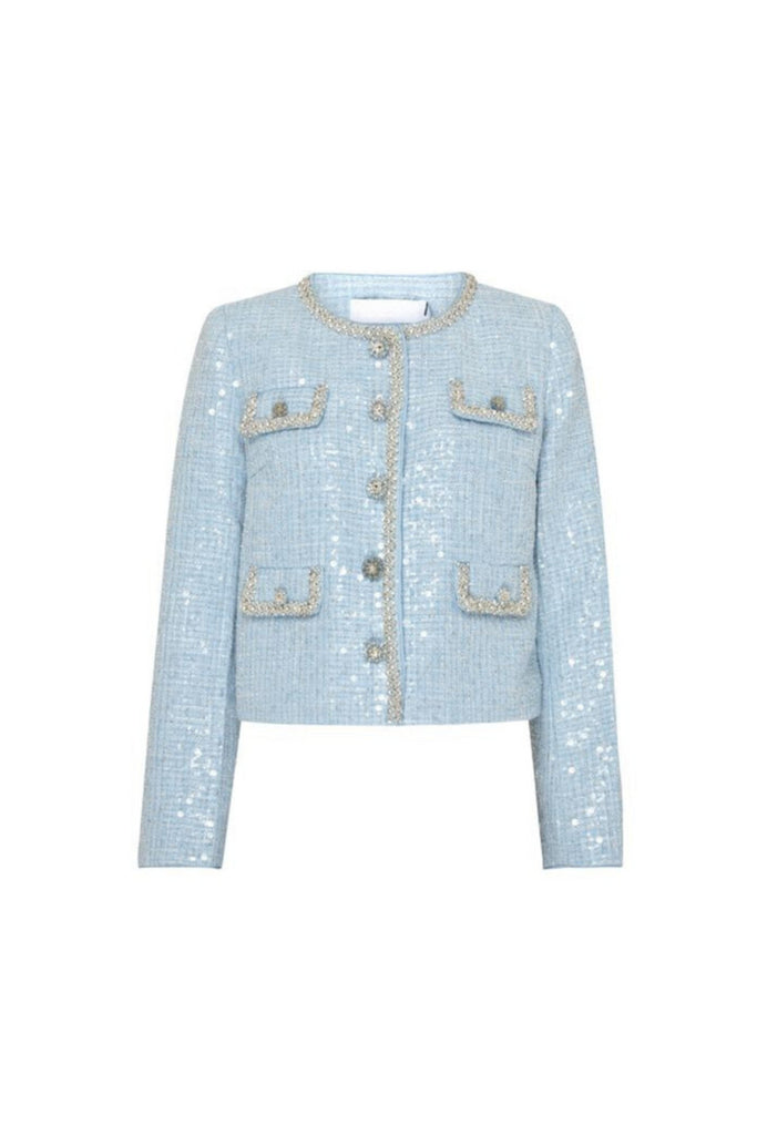 Perfect for any occasion, this unique jacket features a playful mix of sequins and boucle fabric for a touch of fun and sophistication. Make a statement and stand out from the crowd with this must-have piece!