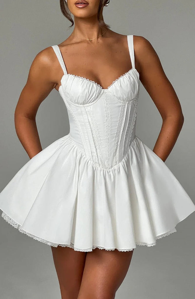 This white mini dress features a delicate lace ruffle trim and a structured corset design, offering a flattering silhouette that enhances your natural shape. Crafted for both elegance and comfort, it’s perfect for special occasions or stylish evening wear. The intricate lace detailing adds a touch of sophistication, while the mini length keeps the look modern and chic.