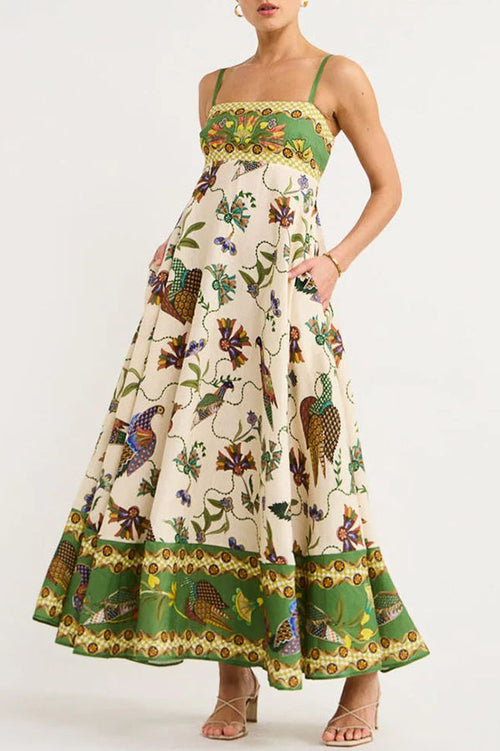 From Sun Drenched Linen Blend Unique Print Smocked Back Pocketed Midi Dress